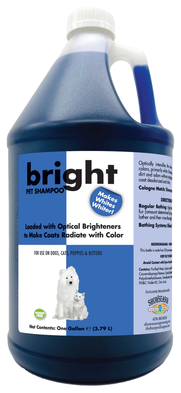 Optically intensifies the shine and depth of all coat colors, especially white. Stains seem to disappear while providing gentle cleansing with the aid of Chamomile that lightens and brightens coats naturally. Bright blends other plant-derived ingredients to create a good lather and removes dirt and odors. Won?��?��?�t strip natural oils and leaves coat deodorized, shiny and manageable.