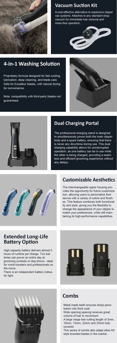 Equipped with exceptional torque (specific torque figure to be inserted), ensuring seamless, obstacle-free cutting through the thickest and densest coats, even on double-coated breeds. Balancing the upper blade in motion well, dampening the noise and improving users' experiences significantly. It also helps extend the service life of blade drive by reducing the wearing dramatically. Runs at an industry-leading <48dB noise level, with no significant vibration. Equipped with two high-energy-density powerful lithium battery packs, allowing you to work seamlessly without any interruptions. Utilizing lithium battery technology, each battery pack supports continuous low speed operation for 210 minutes at full output. The other battery can be fully charged within 60-80 minutes, providing users with a convenient charging experience and long-lasting power support; allowing you to work without waiting. Groomers experience an uninterrupted, continuous work cycle easily. The only clipper on the market with a built-in family-element illumination system, providing 3-stage lighting that penetrates dark, dense, or richly colored coats (black, brown, chocolate). Every detail is revealed for precision grooming. At only 390g, Excalibur II is one of the lightest professional cordless clippers on the market. With a perfectly centered balance point and anti-slip body, it ensures comfort, control, and effortless handling.