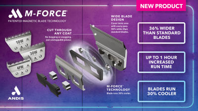 For professional pet groomers and large-animal fitters who need to cover more area in less time without overheating, Andis M-Force reg; 30W ultraEDGE Animal Wide Blade combines magnetic blade tension with a wide blade design. Clip through coats faster and cooler than ever before. nbsp;