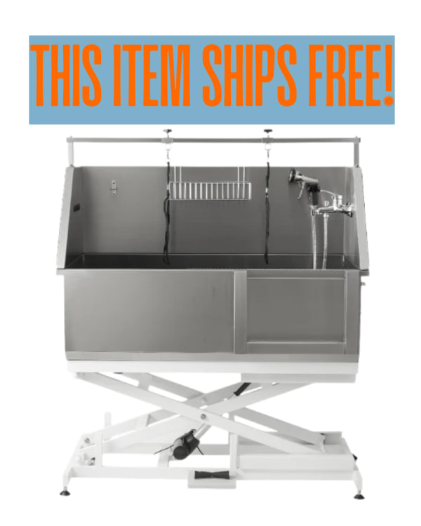 -INCLUDES PUPPY BOOSTER, OVERHEAD ARM, FAUCET KIT (FAUCET, HOSE + SPRAYER, A $200 VALUE) AND DRAIN KIT (INCLUDES DRAIN AND HAIR BASKET AND HOSE), AND EASY CLEAN FLOOR MAT.