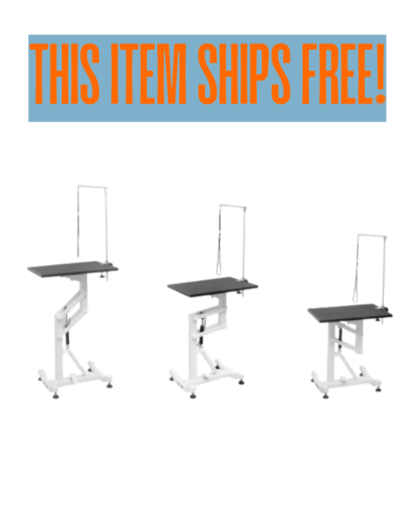 18 X 24 table top swivels 360 ° smoothly on central shaft, making it possible to view the dog from any angle. Easy-to-Control air lift base offers a wide adjustable operation range from 31.5" - 47.25". You will be able to find a comfortable height no matter how tall either you or the dog is. Metal base with scratch resistant white veined powder coating offers secure stability of operation and durable product wear. Comes equipped with a set of aluminum clamp and stainless steel dual purpose grooming arms. 4 colors available for the table top rubber mat.