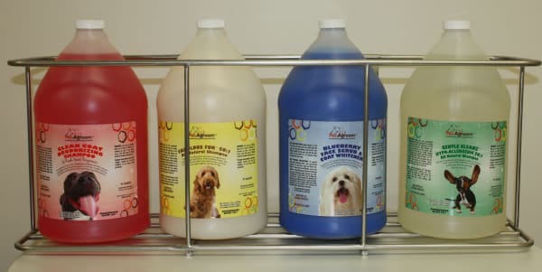 METAL SHAMPOO RACK FOR GALLONS. HOLDS 4 GALLON SIZE JUGS.