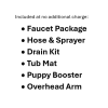 -INCLUDES OVERHEAD ARM, PUPPY BOOSTER, FAUCET KIT (FAUCET, HOSE + SPRAYER, A $200 VALUE) AND DRAIN KIT (INCLUDES DRAIN AND HAIR BASKET AND HOSE), AND EASY CLEAN FLOOR MAT.